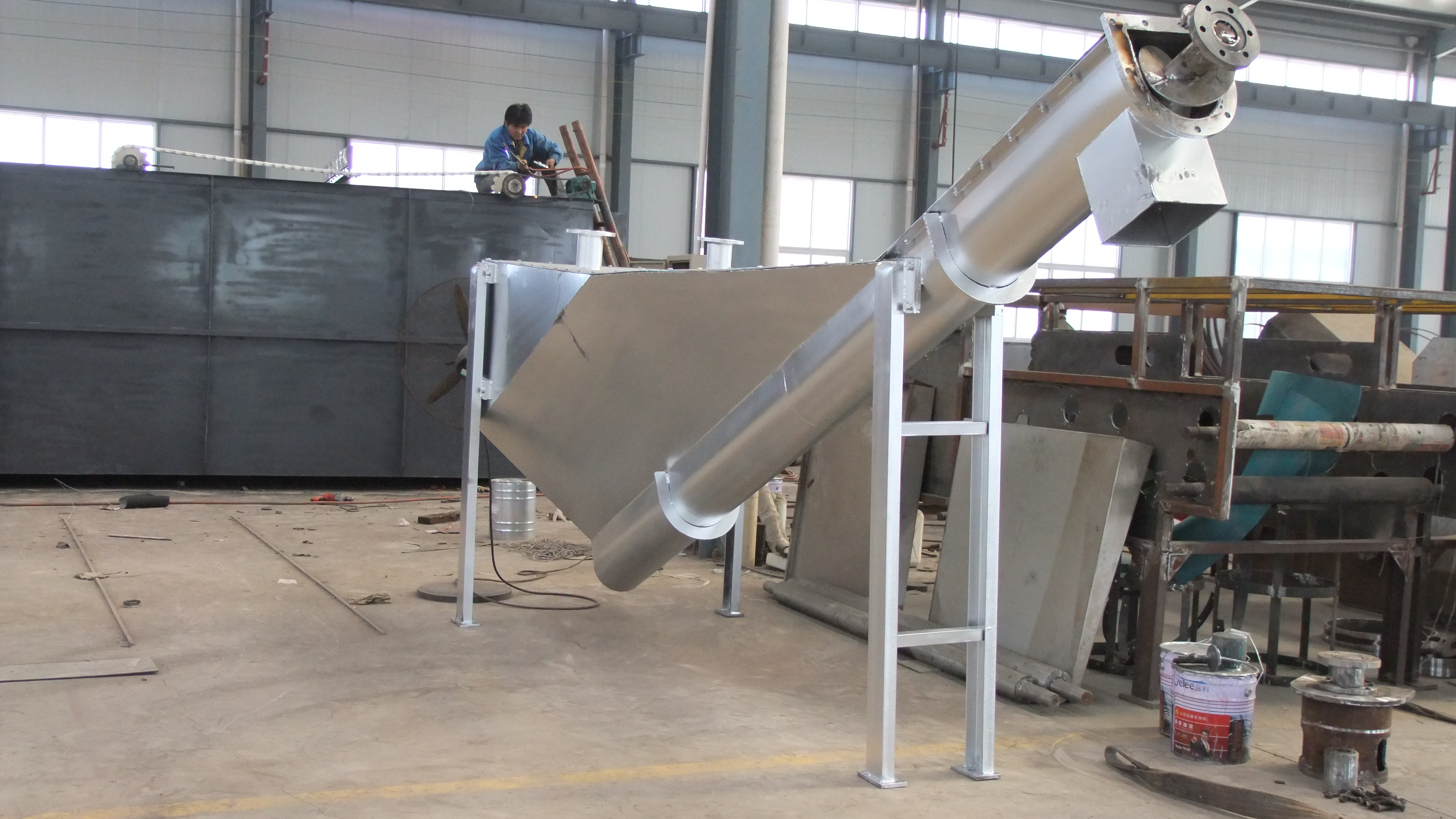 螺旋式砂水分離器安裝傾角在20°-30°之間,砂水混合液從進水管進入水箱,混合液中比重較大的顆粒由于自重面下降沉積于螺旋槽底部,在螺旋的推動下,物料沿斜置的U型槽底部提升,離開液面后,繼續(xù)上移一段距離,砂粒中的水份逐漸在螺旋槽中的間隙中流回水箱,砂粒也逐漸干化在出料口處,依靠自重落入其它輸送裝置。上清液則不斷的從排水管中流出。達到砂水分離目的。